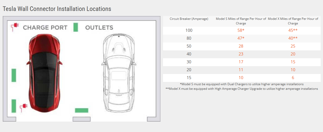 Much like the mobile connector that came with your Tesla Model S, the high power wall connector can be used with any NEMA 40-50 outlet. The notable difference between your mobile connector and high power connector is the high power connector’s ability to exponentially increase your charge mileage in the same amount of time. Typically an eight hour charge with your mobile connector in a standard wall outlet will be about 25-30 miles.